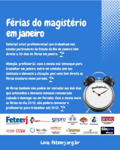 O Sindicato dos Professores de Niterói e Região (Sinpro) informa que todos(as) os(as) professores(a) que trabalham nas escolas particulares do Estado do Rio de Janeiro têm direito a 30 dias de férias no mês de janeiro.